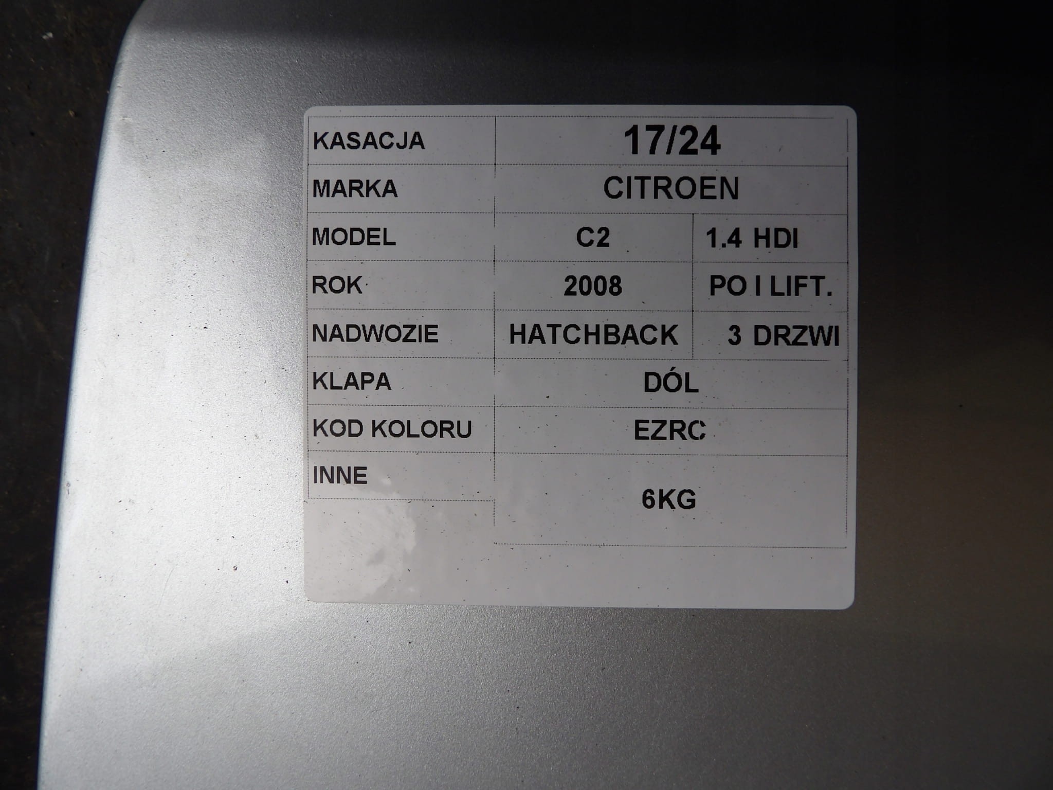 Citroen C2 I klapa tylna dół lak. EZRC