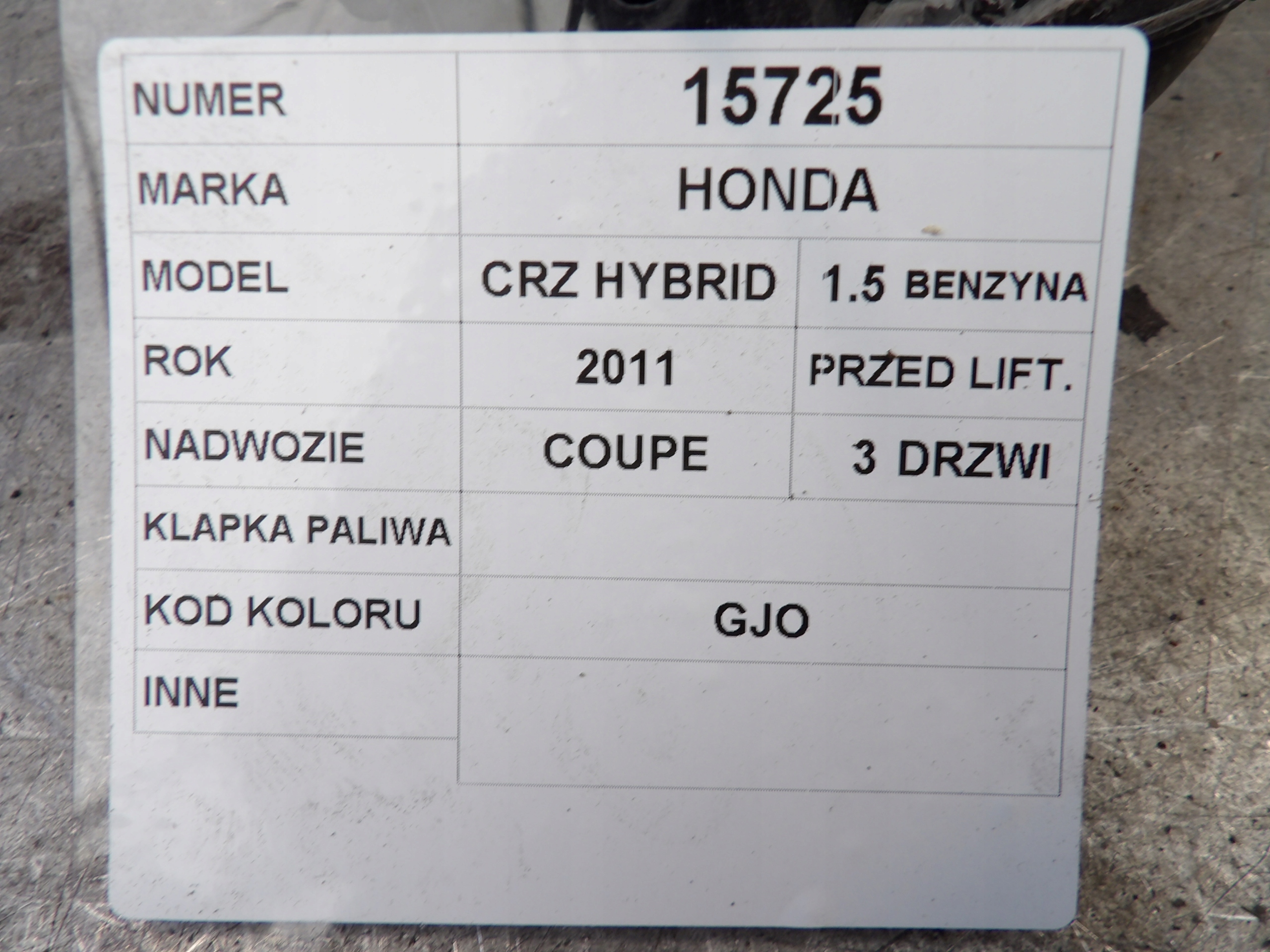 Honda CR-Z klapka paliwa 1,5 Hybrid lak. GJO